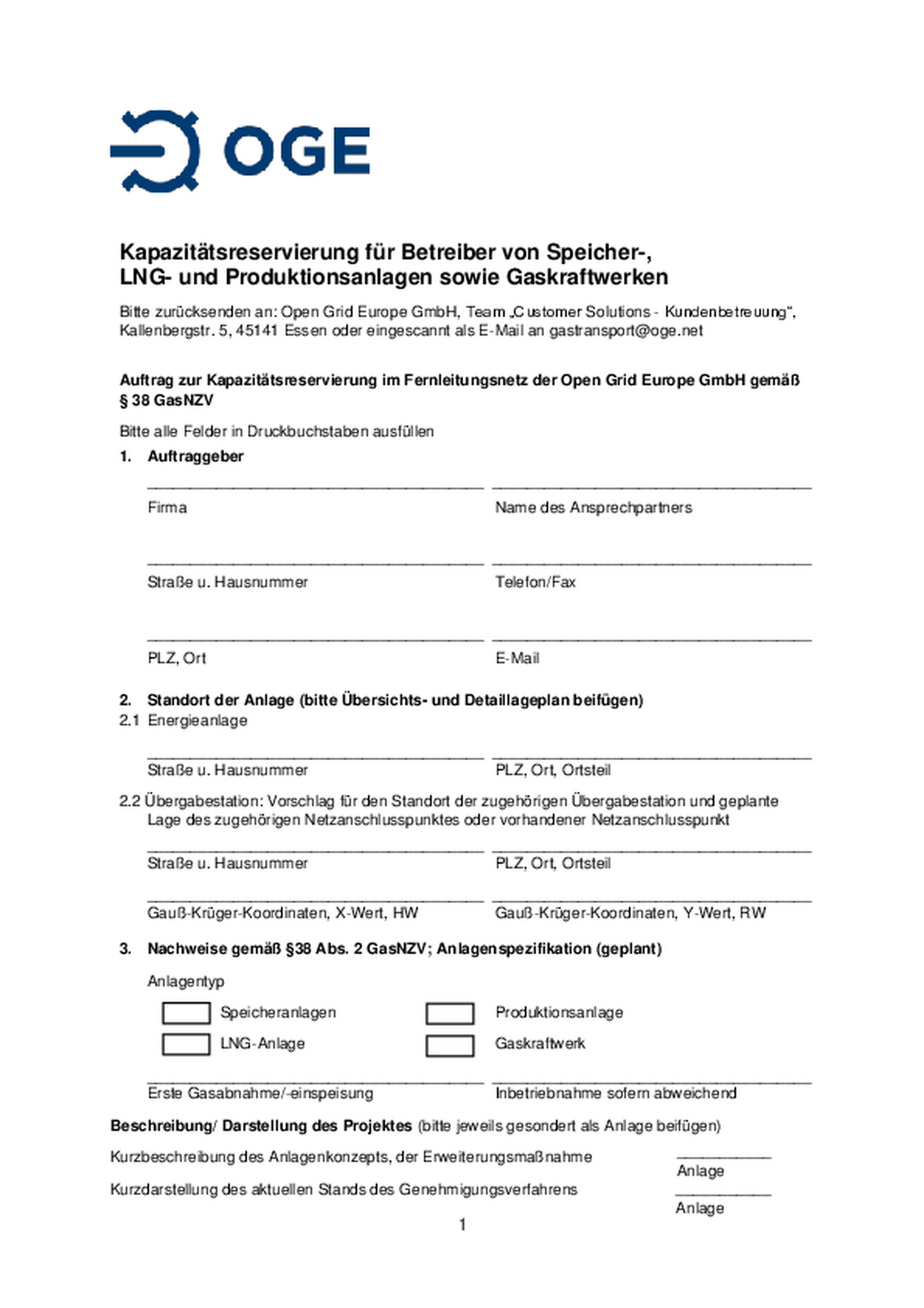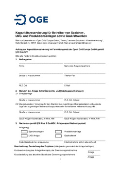 Open Grid Europe bietet seinen Transportkunden ein Formular zur effizienten Abwicklung von Anfragen nach § 38 GasNZV an. Durch die Verwendung des Formulars soll sichergestellt werden, dass Open Grid Europe zeitnah über sämtliche Informationen verfügt, die für eine zügige Bearbeitung Ihrer Anfrage benötigt werden.