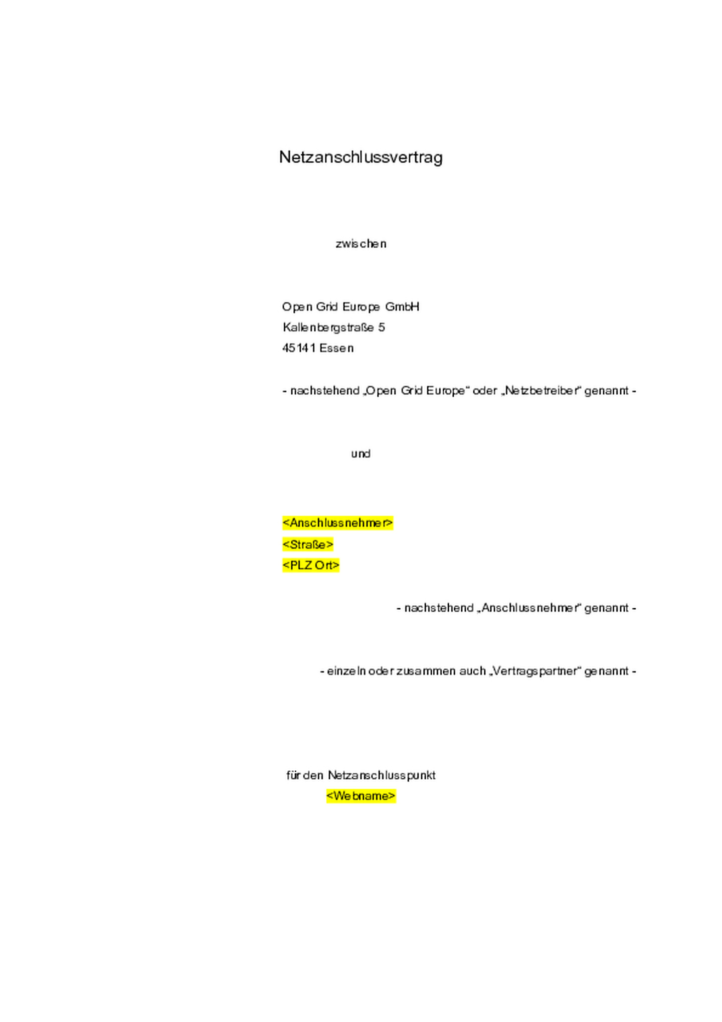 Dieser Vertrag regelt den Anschluss der Gasanlage des Anschlussnehmers an das Gasversorgungsnetz der Open Grid Europe (Netzanschluss) am Netzanschlusspunkt (NAP) zur Entnahme von Gas (Ausspeisepunkt). Dies umfasst insbesondere Regelungen zum Betrieb und zur Änderung der dem NAP zugeordneten Gas-Druckregel- und Messanlage sowie den Informationsaustausch zwischen den Vertragspartnern.