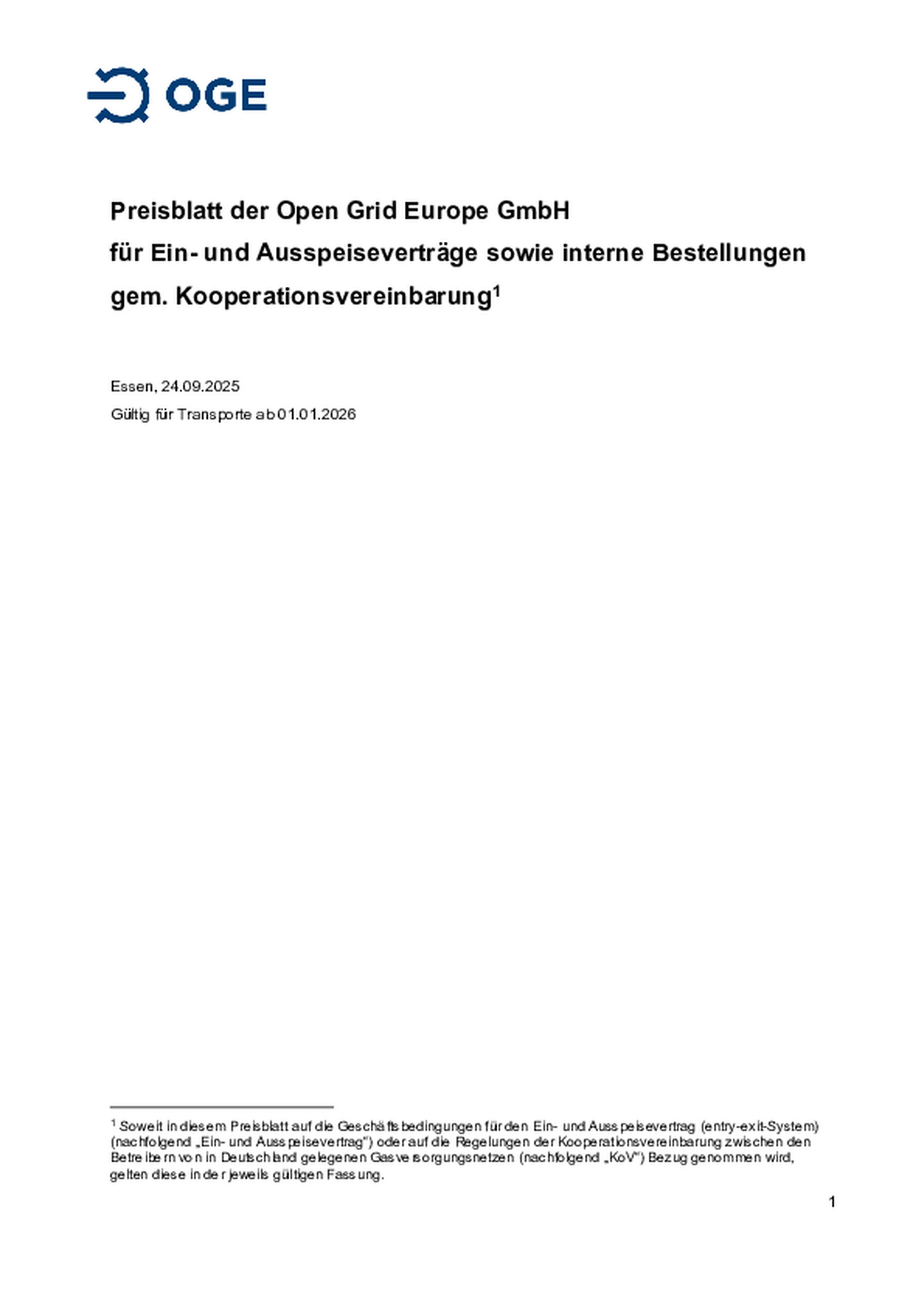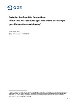 Preisblatt der Open Grid Europe GmbH für Ein- und Ausspeiseverträge sowie interne Bestellungen gem. Kooperationsvereinbarung