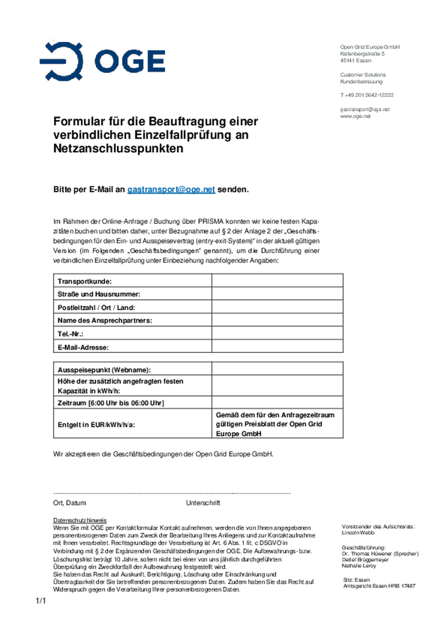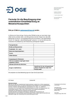 Im Rahmen der Online-Anfrage / Buchung über PRISMA konnten wir keine festen Kapazitäten buchen und bitten daher, unter Bezugnahme auf § 2 der Anlage 2 der „Geschäfts- bedingungen für den Ein- und Ausspeisevertrag (entry-exit-System)“ in der aktuell gültigen Version (im Folgenden „Geschäftsbedingungen“ genannt), um die Durchführung einer verbindlichen Einzelfallprüfung unter Einbeziehung nachfolgender Angaben.