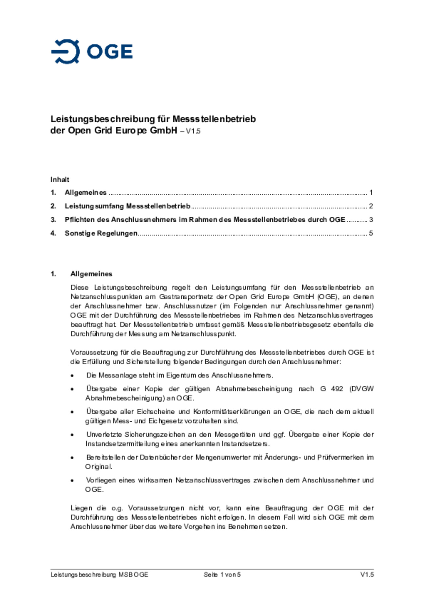Sofern Open Grid Europe mit der Durchführung des Messstellenbetriebes an Netzanschlusspunkten beauftragt wurde, erbringt Open Grid Europe diese Dienstleistung gemäß der veröffentlichten Leistungsbeschreibung für Messstellenbetrieb.