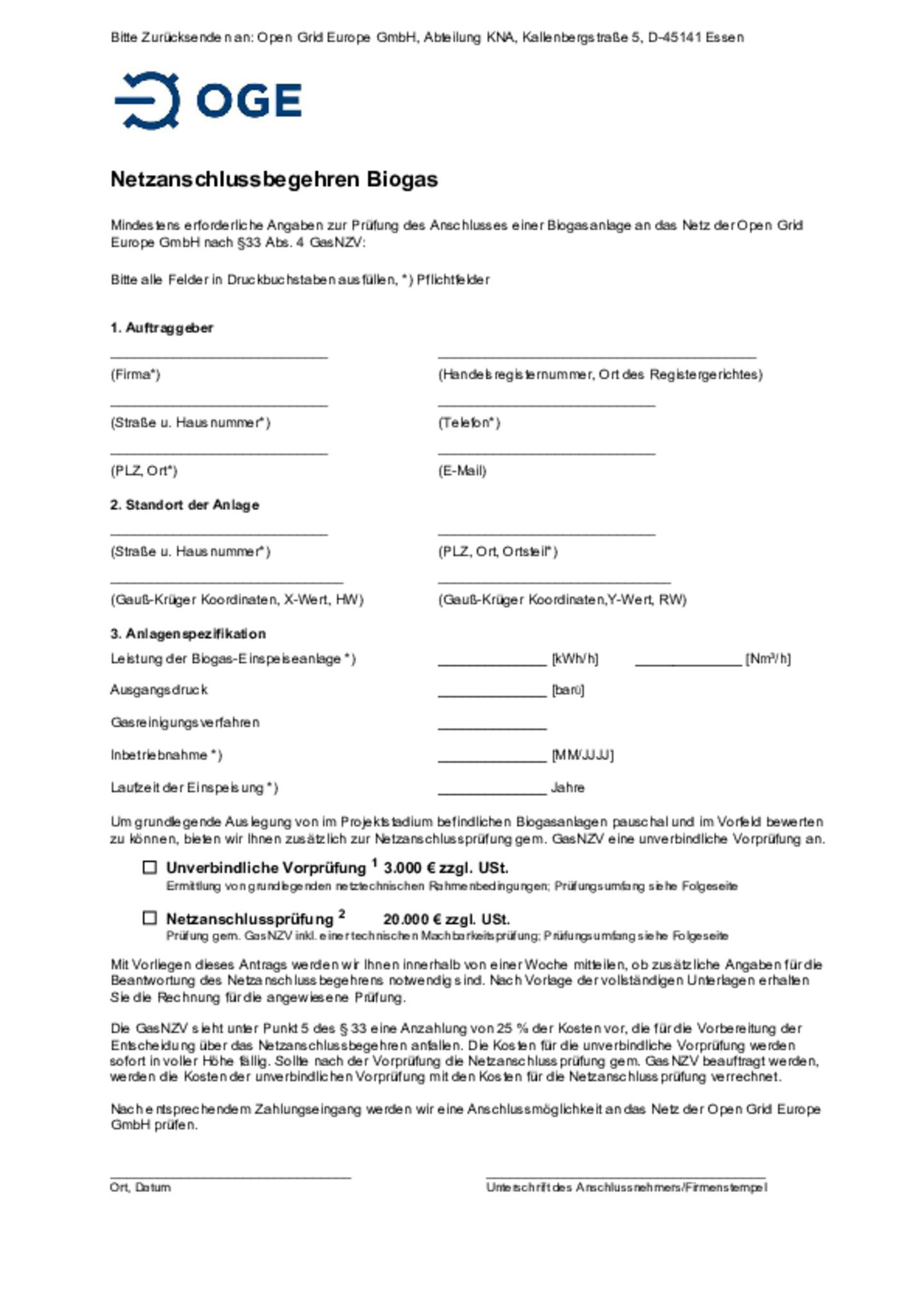 Mindestens erforderliche Angaben zur Prüfung des Anschlusses einer Biogasanlage an das Netz der Open Grid Europe GmbH nach § 33 GasNZV.