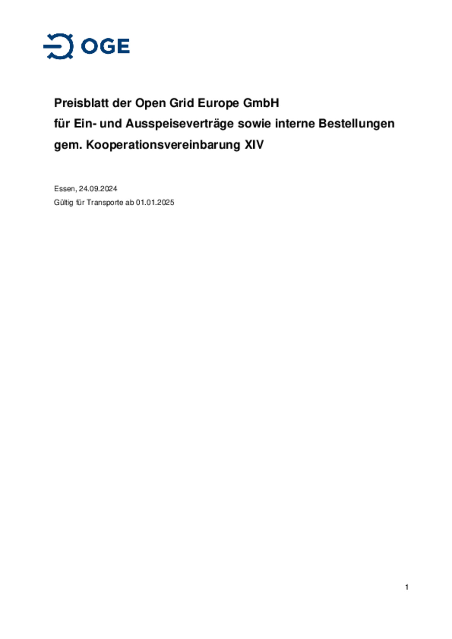 Preisblatt der Open Grid Europe GmbH für Ein- und Ausspeiseverträge sowie interne Bestellungen gem. Kooperationsvereinbarung XIV