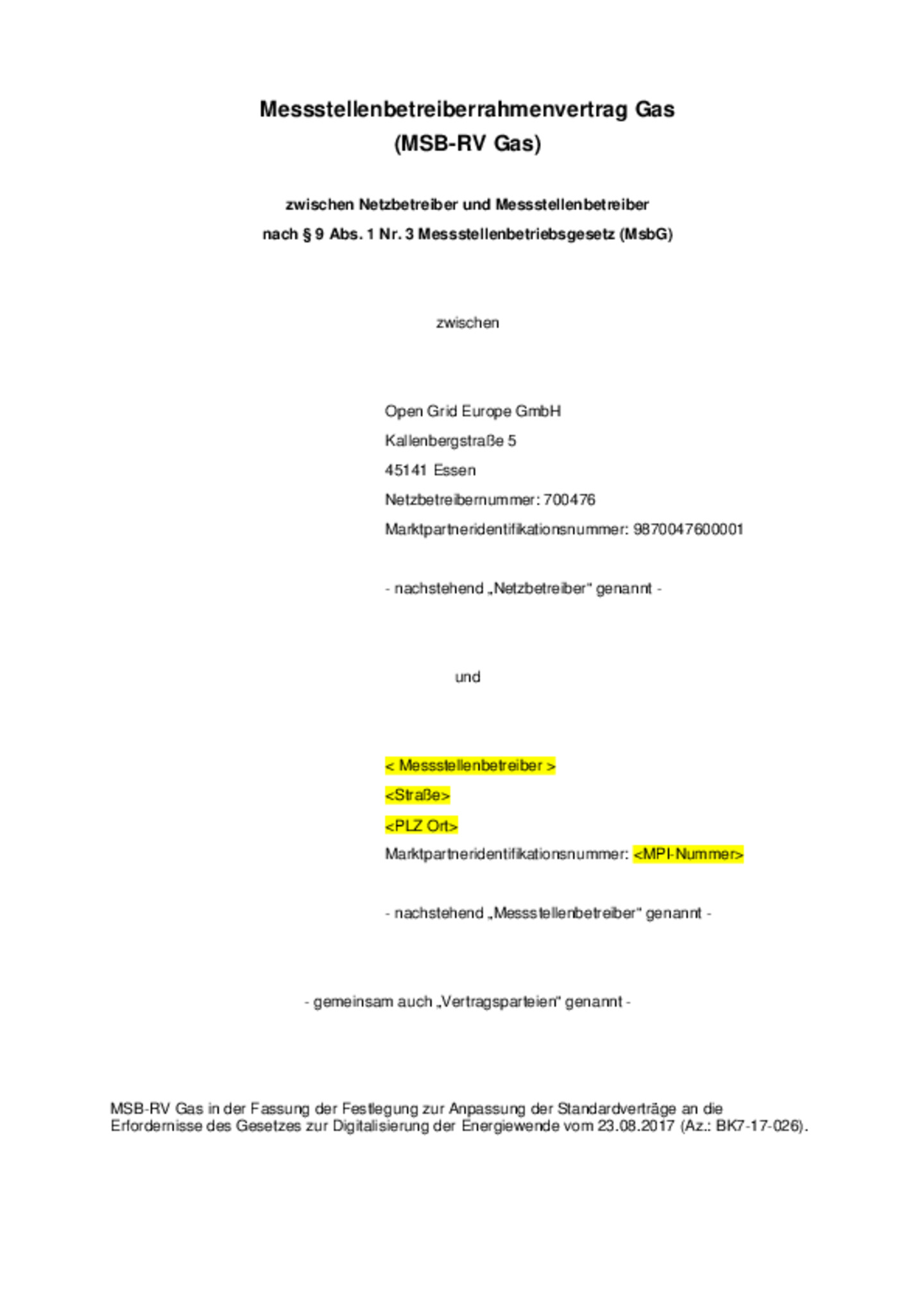 Messstellenbetreiber i.S.d. § 2 Ziff. 12 Messstellenbetriebsgesetz (MsbG) sowie Betreiber von Gasversorgungsnetzen i.S.d. § 3 Ziff. 6 Energiewirtschaftsgesetz (EnWG) sind verpflichtet, neu abzuschließende Messstellenbetreiberrahmenverträge nach § 9 Abs. 1 Ziff. 3 MsbG gemäß dem Beschluss der Bundesnetzagentur vom 23.08.2017 abzuschließen (Az.: BK7-17-026). Der Beschluss regelt die Anpassung der Standardverträge an die Erfordernisse des Gesetzes zur Digitalisierung der Energiewende. Der hier zum Download zur Verfügung stehende Messstellenbetreiberrahmenvertrag Gas (MSB-RV Gas) entspricht wie gefordert der Änderung des Messstellenrahmenvertrags Gas, festgelegt am 09.09.2017 in dem Verfahren BK7-09-001 zum MSB-RV Gas.