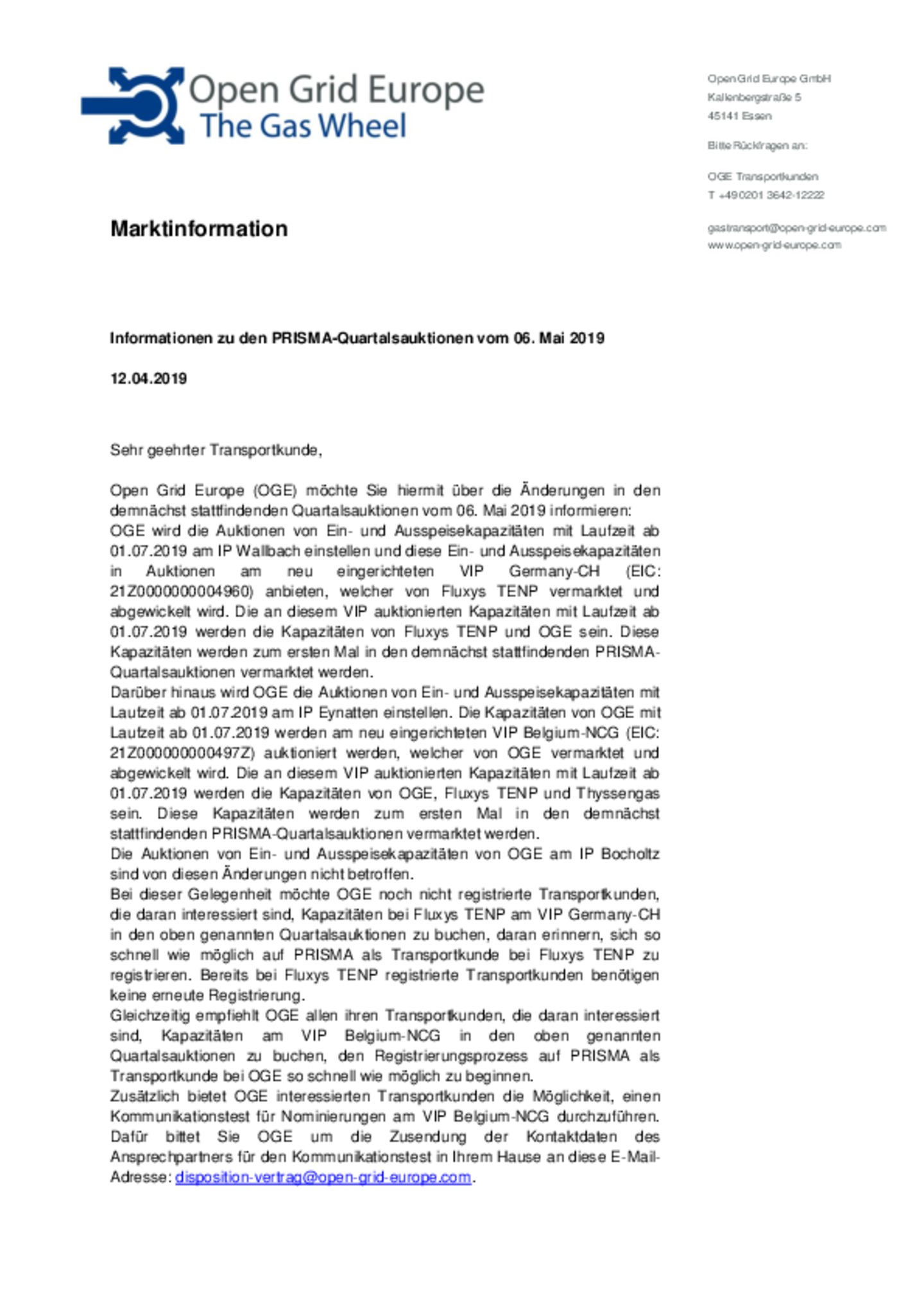 Weitere Details zur Umsetzung dieser VIPs (z.B. EIC-Codes) teilten die FNB dem Markt ebenfalls mit ausreichendem Vorlauf mit. Die beteiligten FNB möchten bei dieser Gelegenheit nochmals darauf hinweisen, dass für Transportkunden in der Abwicklung keine größeren Veränderungen zu erwarten sind. Dies gilt insbesondere auch für Transportkunden, die an den relevanten IPs bereits aktiv sind. Da am VIP Belgium-NCG Open Grid Europe und am VIP Germany-CH Fluxys TENP die VIP-Abwicklung durchführen wird (als VIP-FNB) und die heutigen Prozesse weitestgehend unverändert bleiben wer-den, ist die Mitwirkungspflicht von Transportkunden vor der Netznutzung darauf beschränkt, sich über die Kapazitätsplattform PRISMA beim VIP-FNB zu registrieren, sofern sie bisher nicht bereits bei diesem FNB registriert sind, und einen Kommunikationstest durchzuführen. Eine solche Registrierung ist jetzt schon möglich. Für die Registrierung und Schnittstelleneinrichtung wird der jeweilige VIP-FNB ausreichend Zeit einräumen.