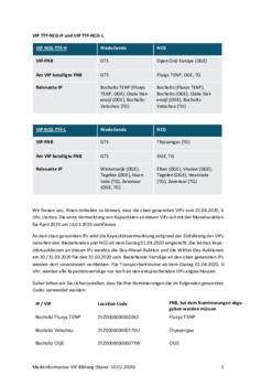 An den oben genannten IPs wird die Kapazitätsvermarktung aufgrund der Einführung der VIPs zwischen den Niederlanden und NCG ab dem Gastag 01.04.2020 eingestellt. Die letzten Kapazitätsauktionen an diesen IPs werden die Day-Ahead-Auktion und die Within-Day-Auktionen am 30./31.03.2020 für den 31.03.2020 sein. Bestehende Verträge an den oben genannten IPs werden dort unverändert verbleiben. Für Transportzeiträume ab dem Gastag 01.04.2020, 6 Uhr, werden alle Kapazitätsverträge nur noch an den entsprechenden VIPs abgeschlossen.