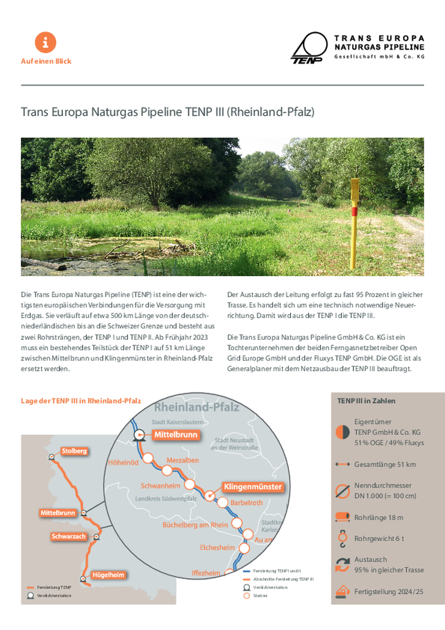 Der Austausch der Leitung erfolgt in allen Bereichen weitestgehend in gleicher Trasse. Es handelte sich um eine technisch notwendige Neuerrichtung. Damit wurde aus der TENP I die TENP III. Sie ist H2-ready. Die Inbetriebnahme erfolgte im Juli 2025.