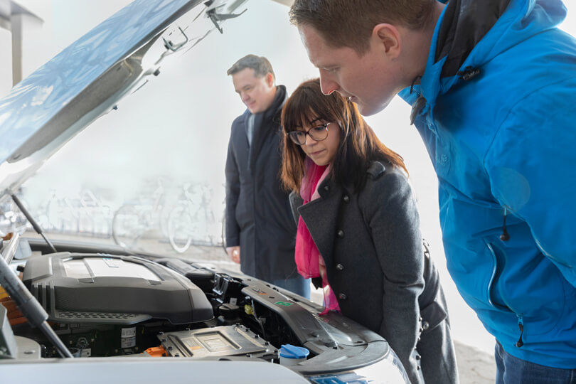 Kurz vor der Abfahrt kommt Projektleiter Martin Frings zum Fahrzeug. Mahsa Siebold, die einmal die Projektleitung für die technische Umsetzung von Westküste 100 übernehmen wird und ihr Kollege aus der Projektkommunikation Andreas Lehmann wollen noch nicht einsteigen. Gemeinsam schauen die Fachleute unter die Motorhaube. Wo ist die Brennstoffzelle? Wo ist der Tank?