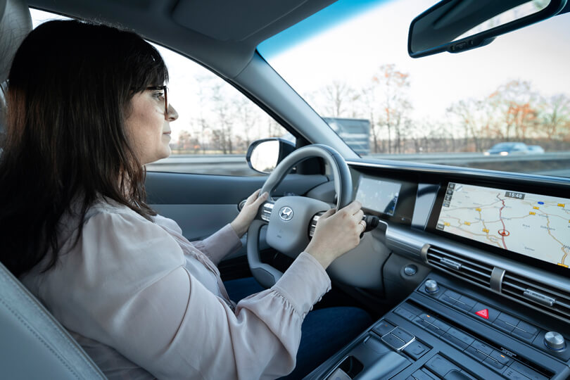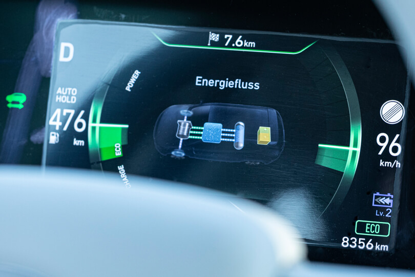 Im Innenraum des Wasserstoffautos fällt gleich das große Display auf, das quasi die Fahrzeugtechnik grafisch abbildet. Den Fahrer kann das verwirren, aber interessant ist es schon zu sehen, wieviel Wasserstoff gerade umgewandelt wird und wie sich die Reichweite reduziert, wenn man mal richtig aufs Gaspedal drückt.