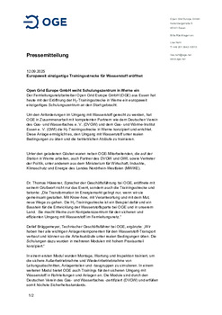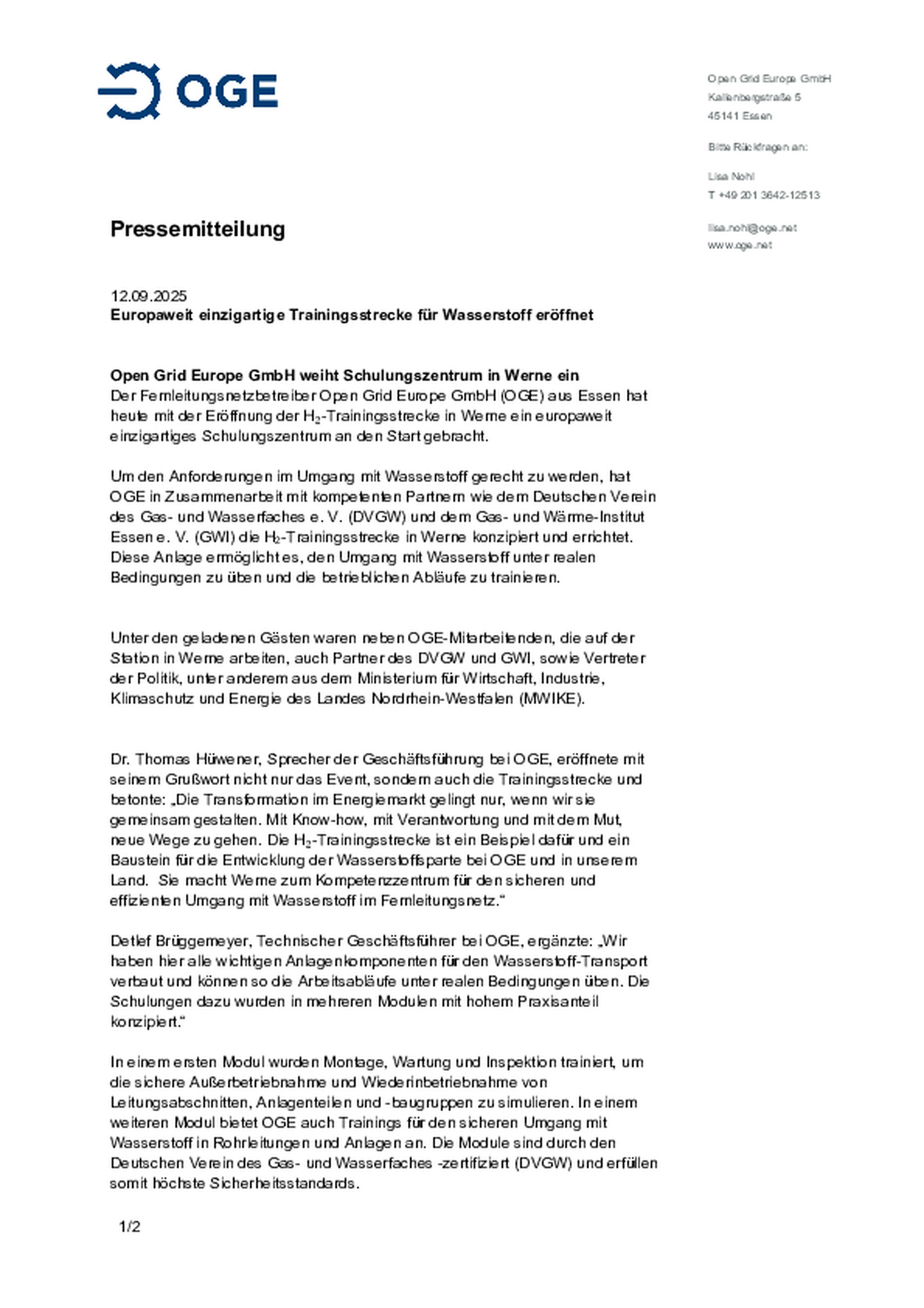 Open Grid Europe GmbH weiht Schulungszentrum in Werne ein. Der Fernleitungsnetzbetreiber Open Grid Europe GmbH (OGE) aus Essen hat heute mit der Eröffnung der H₂-Trainingsstrecke in Werne ein europaweit einzigartiges Schulungszentrum an den Start gebracht.