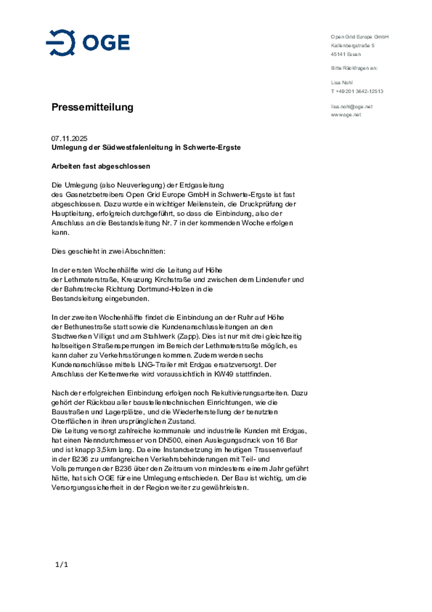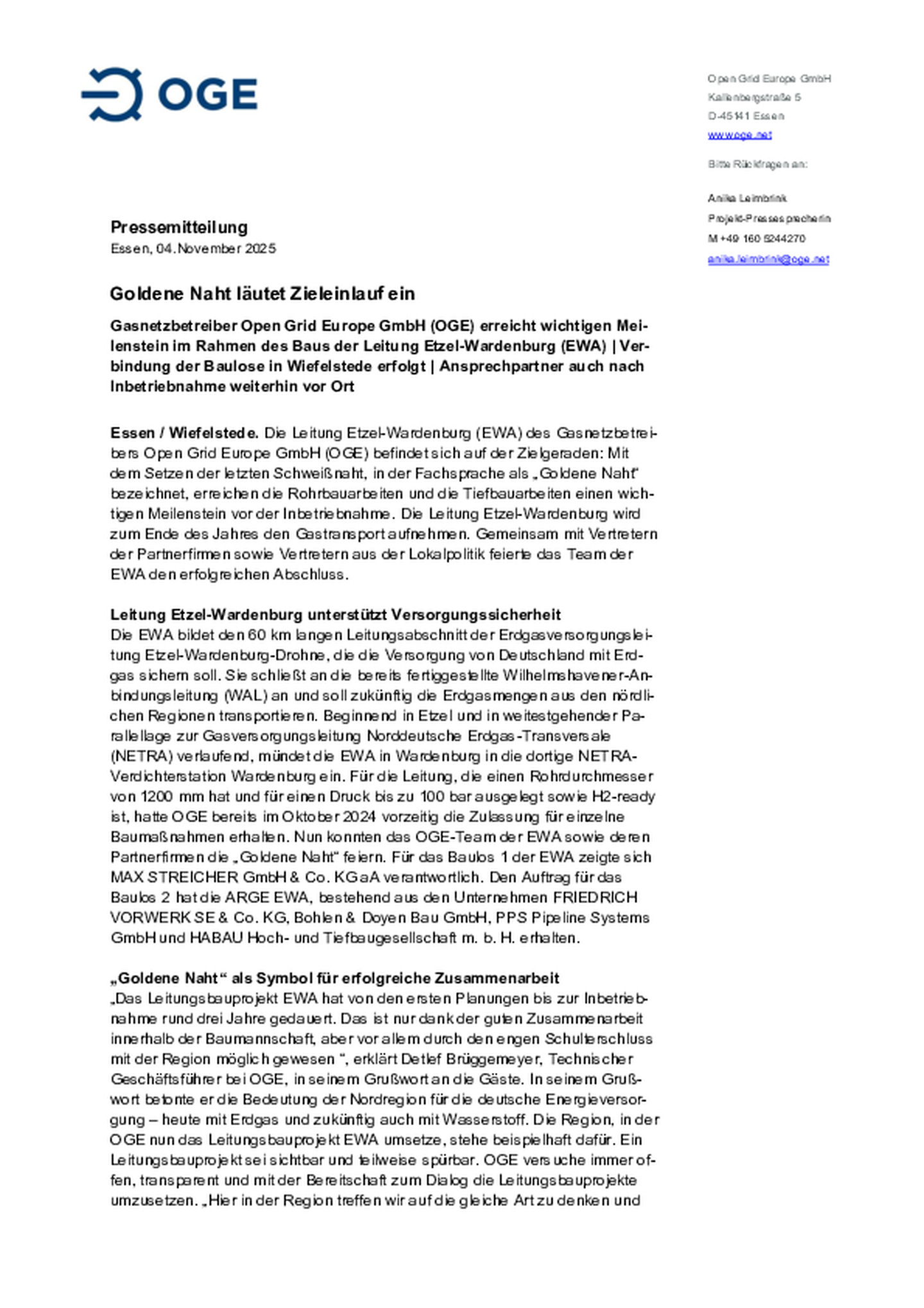Gasnetzbetreiber Open Grid Europe GmbH (OGE) erreicht wichtigen Meilenstein im Rahmen des Baus der Leitung Etzel-Wardenburg (EWA). Verbindung der Baulose in Wiefelstede erfolgt. Ansprechpartner auch nach Inbetriebnahme weiterhin vor Ort.