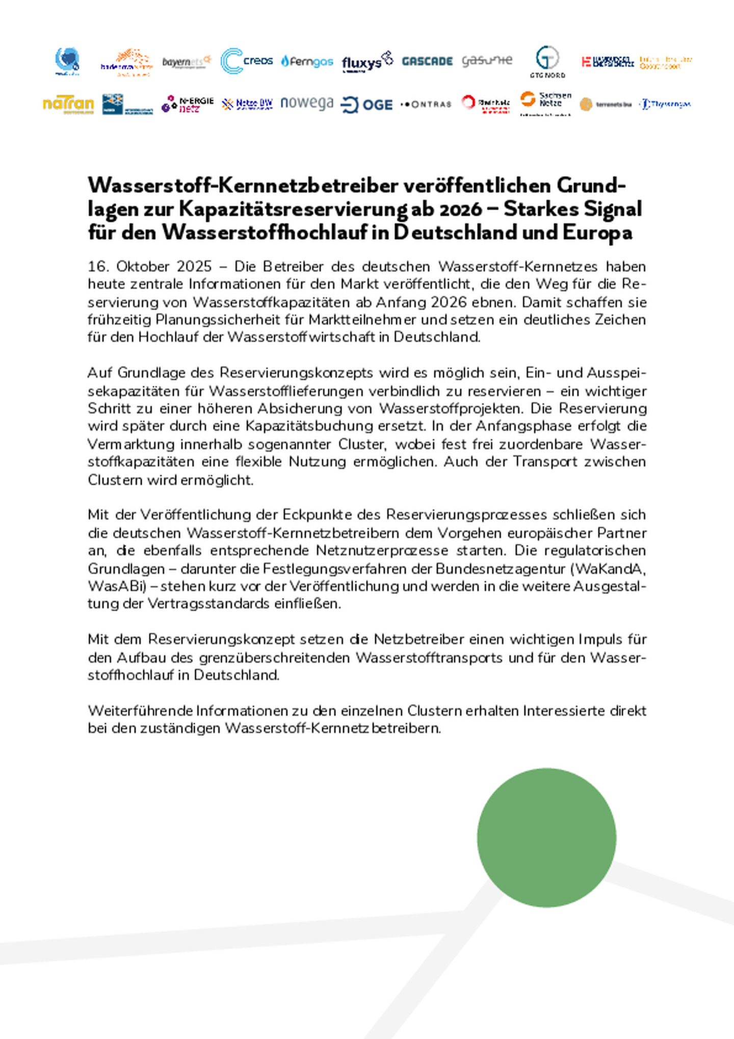 Wasserstoff-Kernnetzbetreiber veröffentlichen Grund- lagen zur Kapazitätsreservierung ab 2026 – Starkes Signal für den Wasserstoffhochlauf in Deutschland und Europa