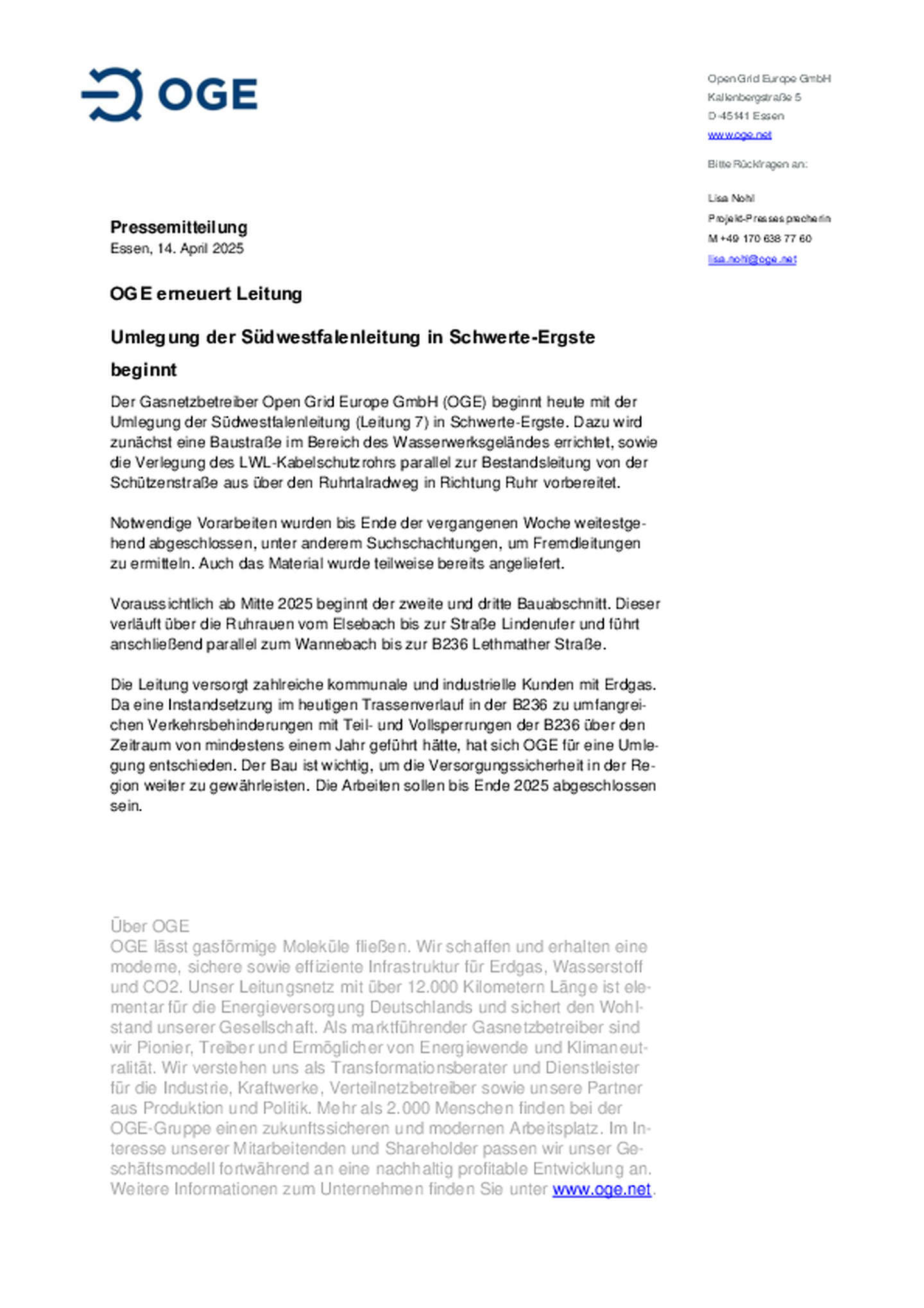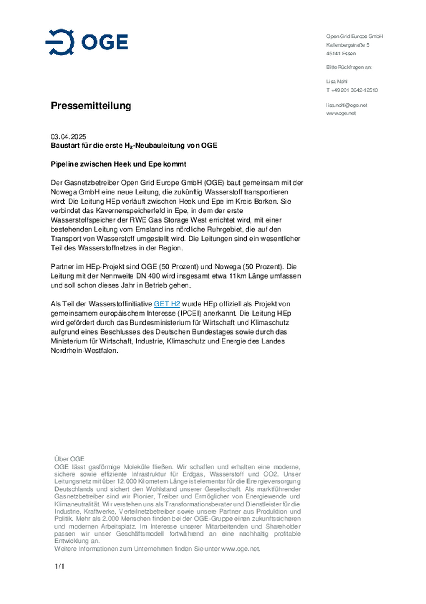 Der Gasnetzbetreiber Open Grid Europe GmbH (OGE) baut gemeinsam mit der Nowega GmbH eine neue Leitung, die zukünftig Wasserstoff transportieren wird: Die Leitung HEp verläuft zwischen Heek und Epe im Kreis Borken.