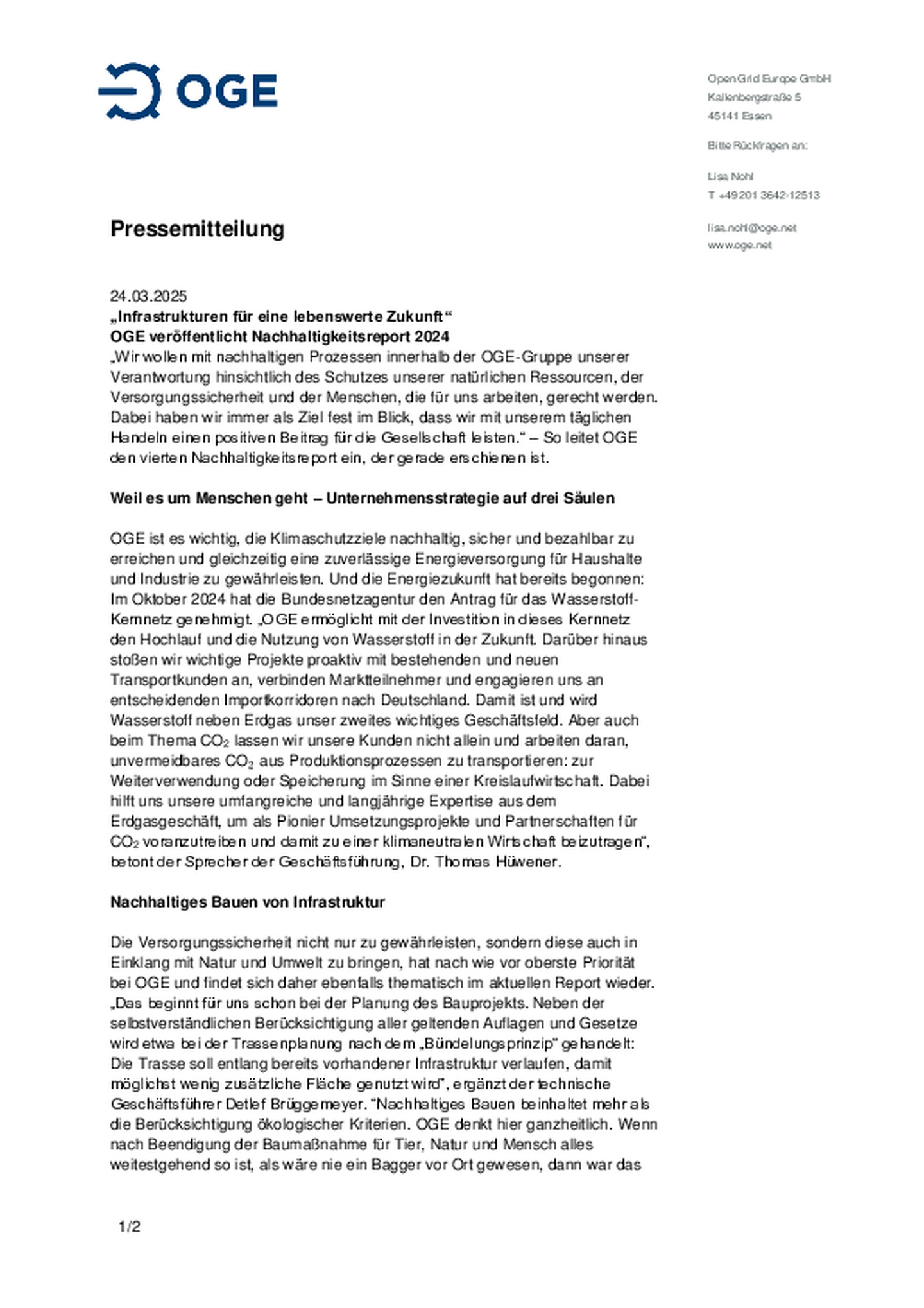 OGE veröffentlicht Nachhaltigkeitsreport 2024