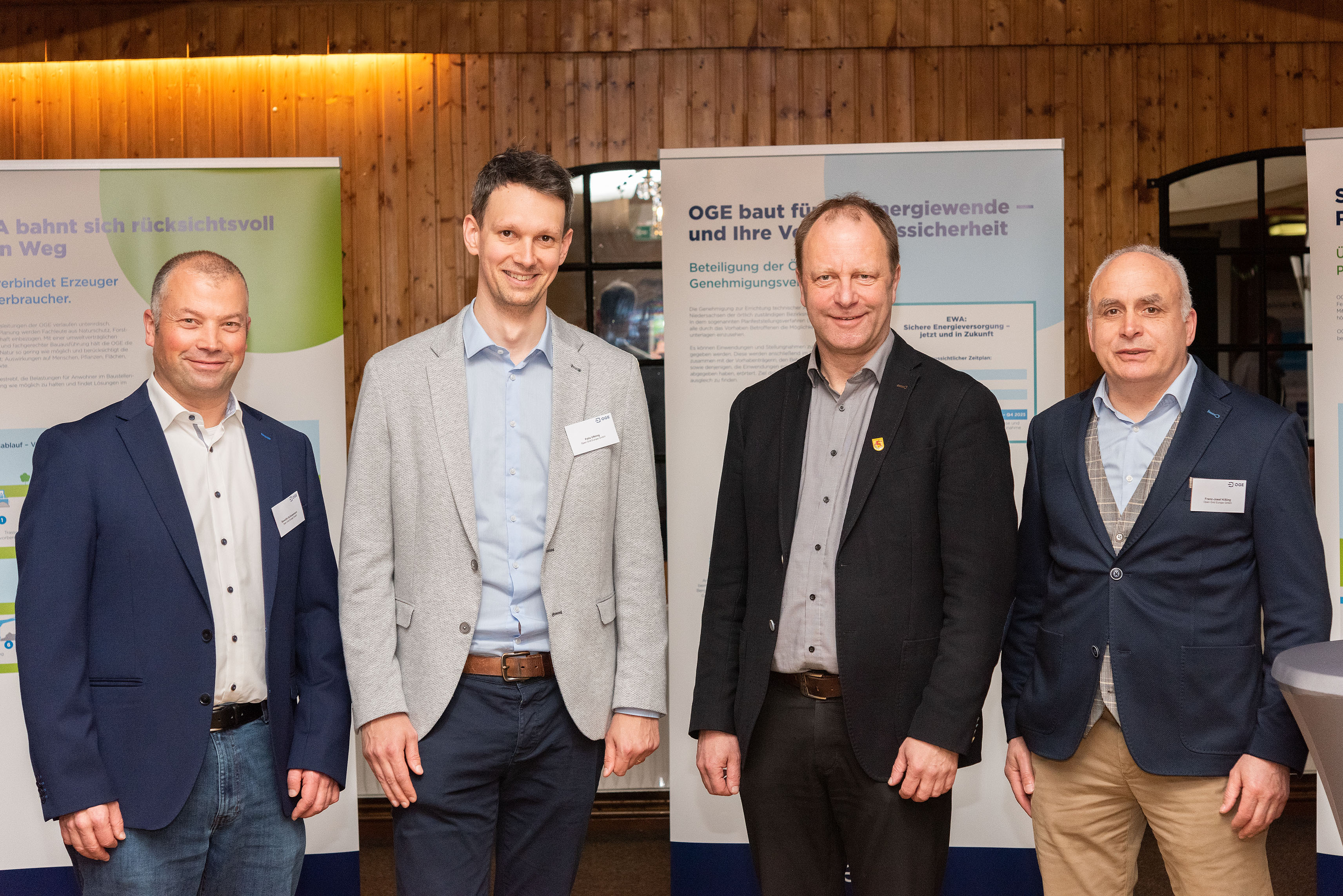 OGE vor Ort in Bockhorn im Dialog, v. l. Benedikt Schlusemann (OGE/Trassenplanung), Felix Uftring (OGE/EWA-Projektleitung), Thorsten Krettek (Bürgermeister Bockhorn), Franz-Josef Kissing (OGE/EWA-Projektleitung)