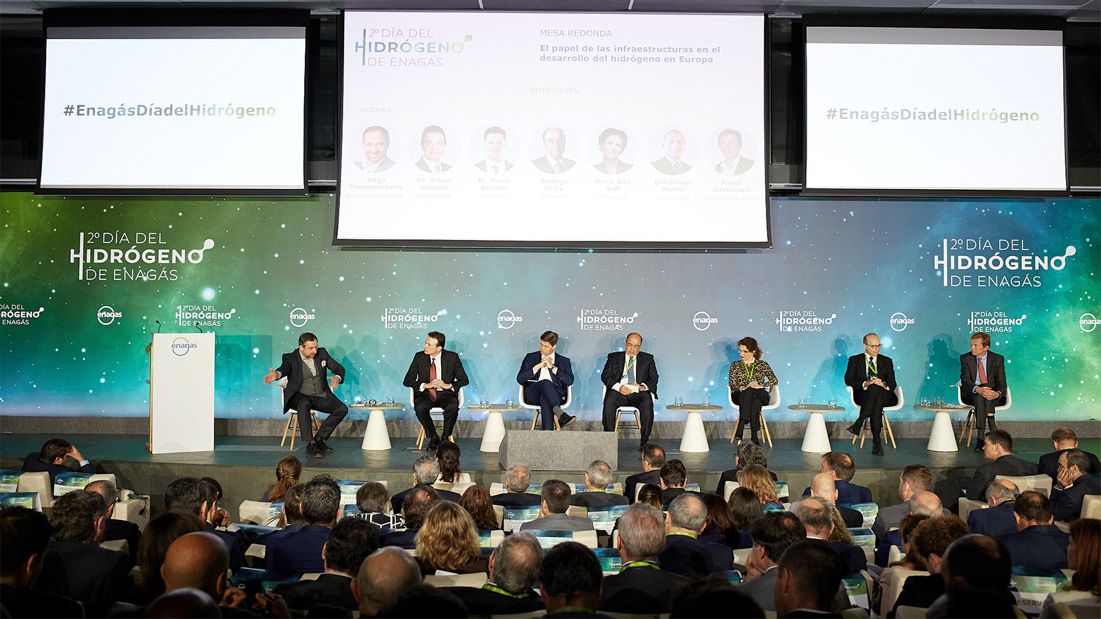 v. l. n. r. Jorgo Chatzimarkakis (Moderator), Hydrogen Europe; Arturo Gonzalo, Enagas; Frank Reiners, OGE; Rodrigo Costa, REN; Maria Rita Galli, DESFA; Dominique Mockly, Terega; Pierre Duvieusart, GRTgaz
