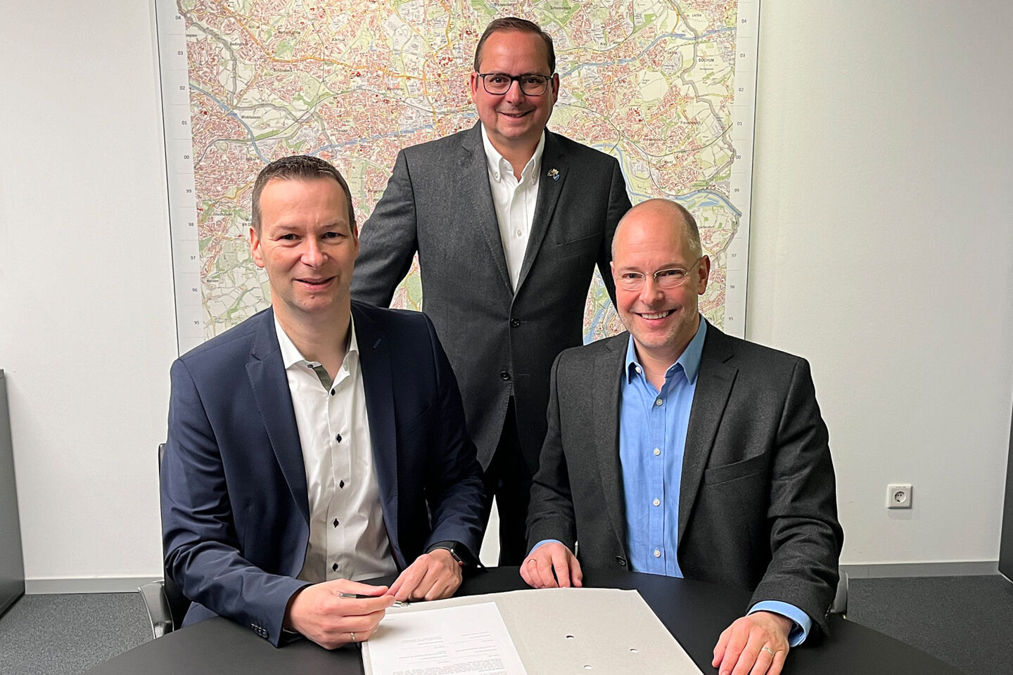 Unterzeichnen die Partnerschaftsvereinbarung: v. l. Dr. Thomas Hüwener, CEO von OGE, Thomas Kufen, Oberbürgermeister der Stadt Essen sowie Dr. Frank Pieper, Vorstandsvorsitzender der Stadtwerke Essen.