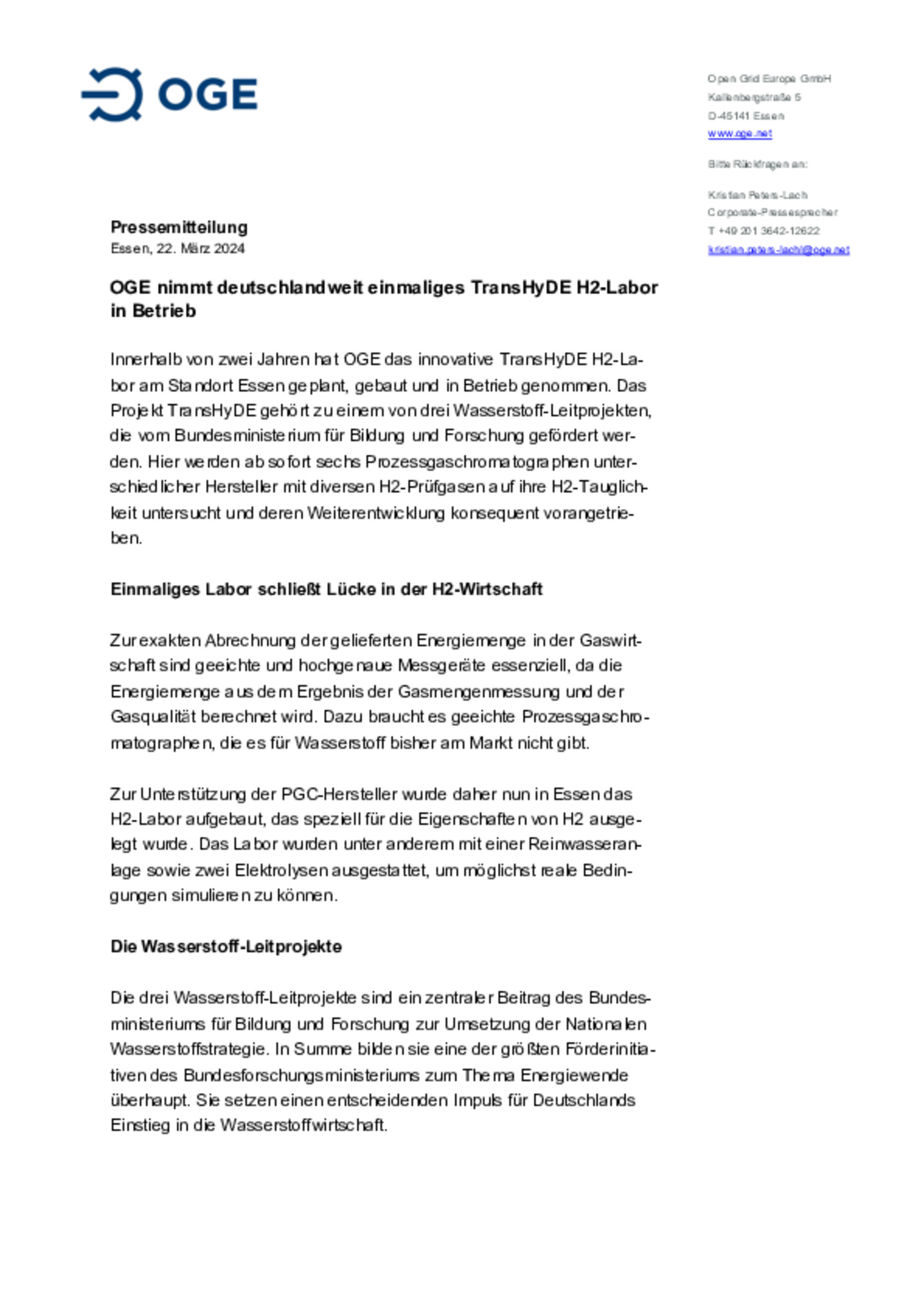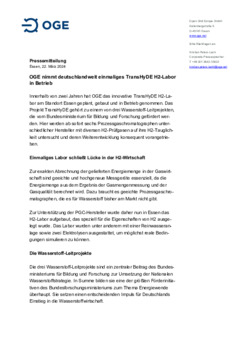 OGE nimmt deutschlandweit einmaliges TransHyDE H2-Labor in Betrieb