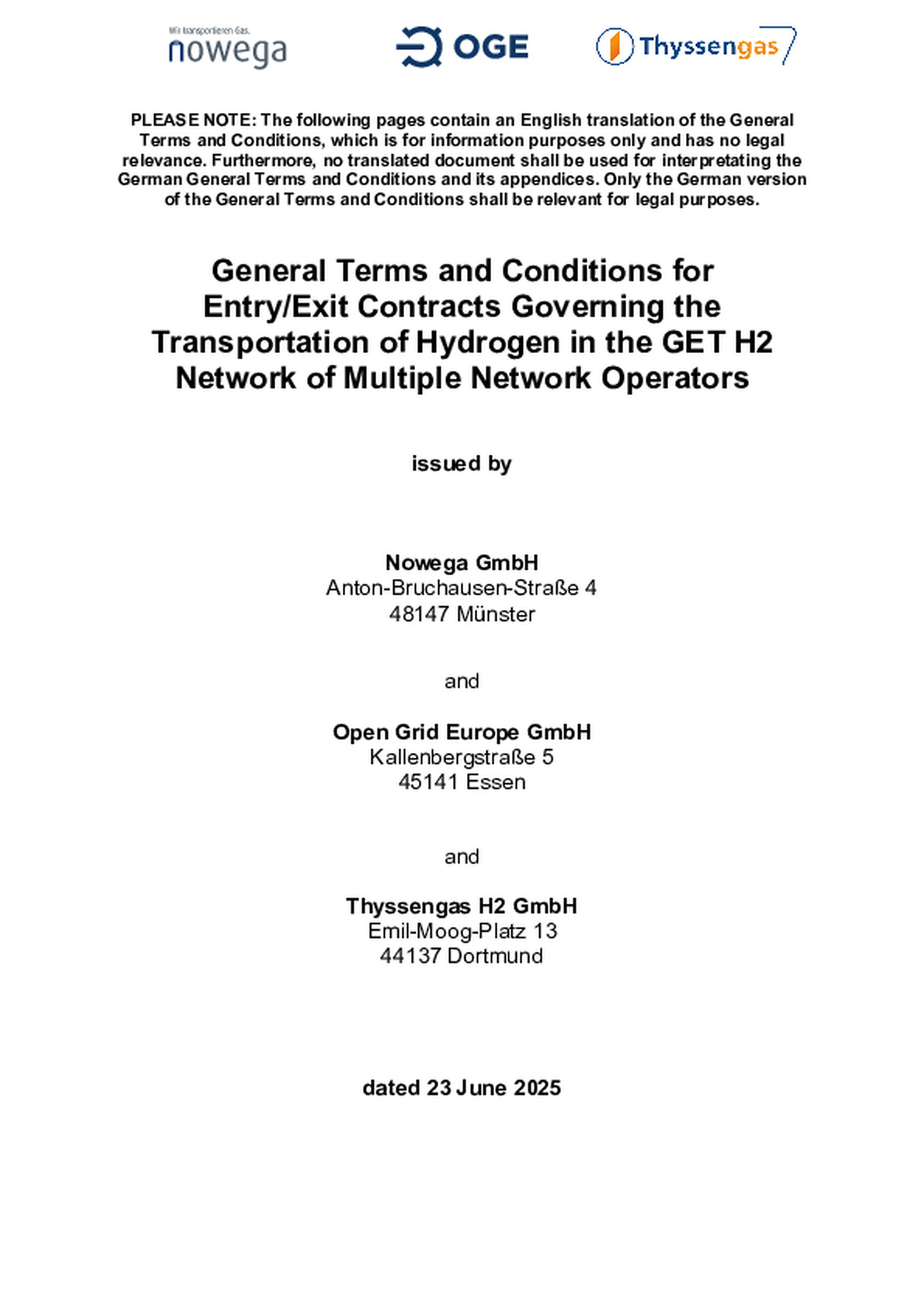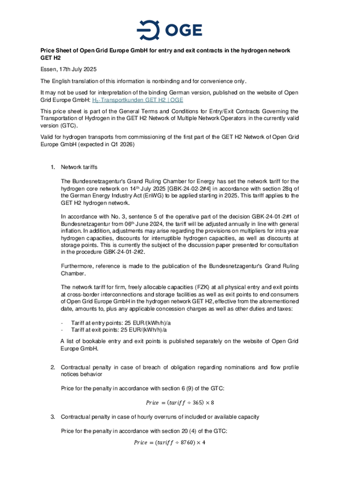 This price sheet is part of the General Terms and Conditions for Entry/Exit Contracts Governing the Transportation of Hydrogen in the GET H2 Network of Multiple Network Operators in the currently valid version (GTC). Valid for hydrogen transports from commissioning of the first part of the GET H2 Network of Open Grid Europe GmbH (expected in Q1 2026). Status 17 July 2025