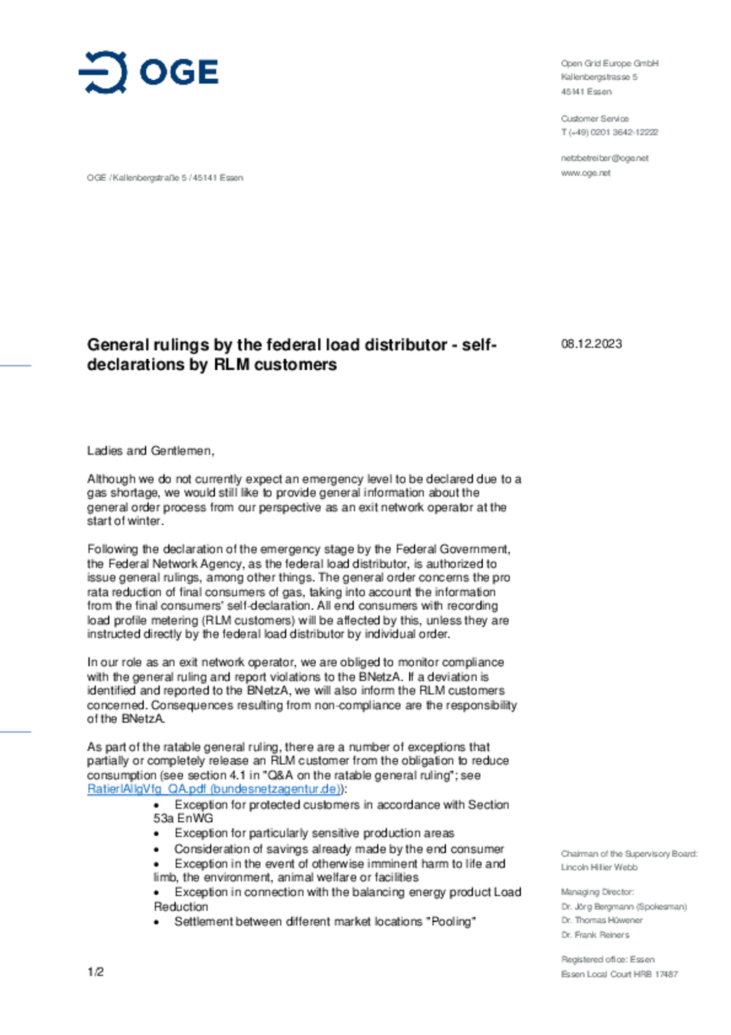 General rulings by the federal load distributor - self-declarations by RLM customers