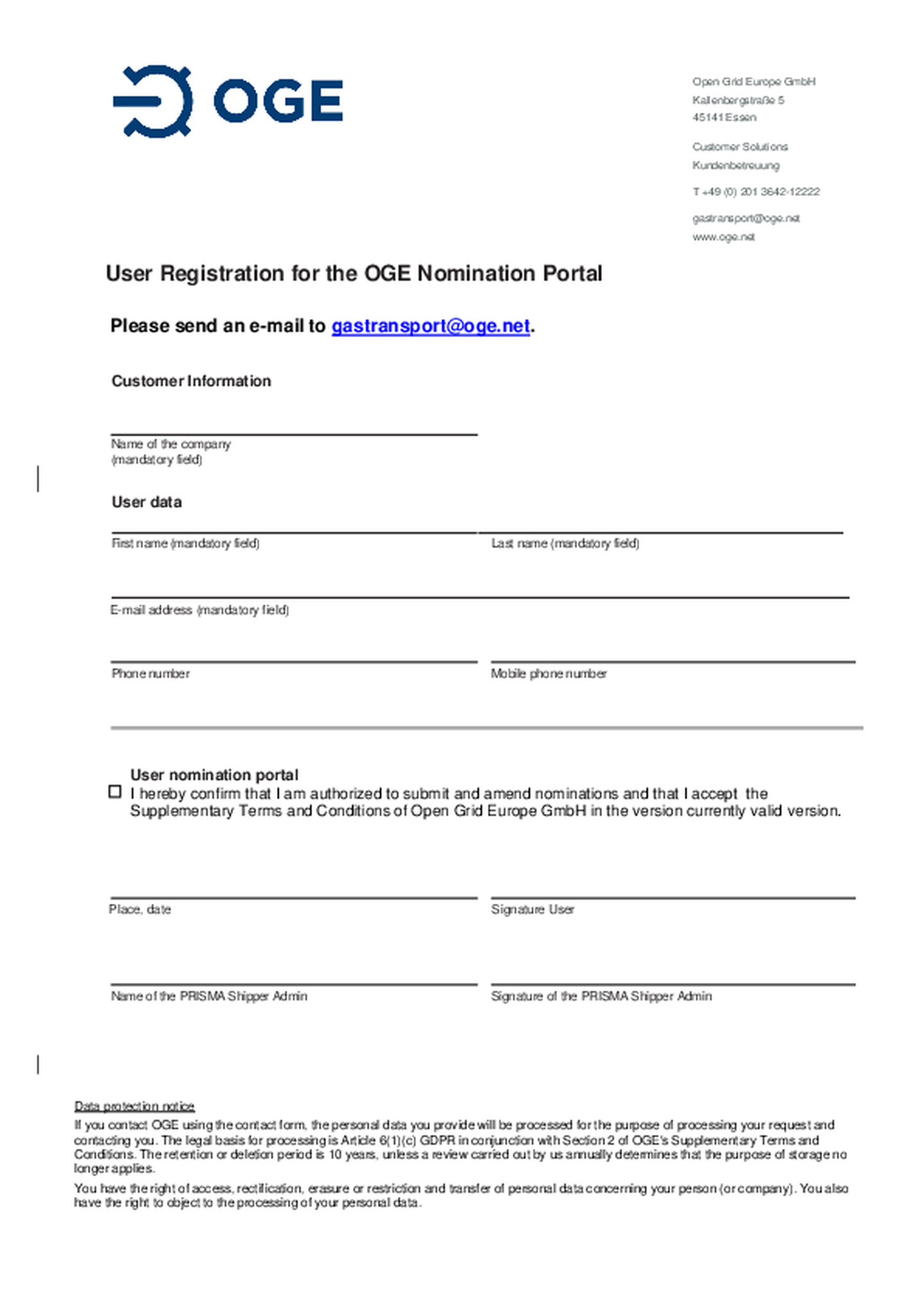 Once you have assigned OGE as your TSO on PRISMA, you’ll need to complete and submit the OGE registration form. This form is available for download on the PRISMA platform.