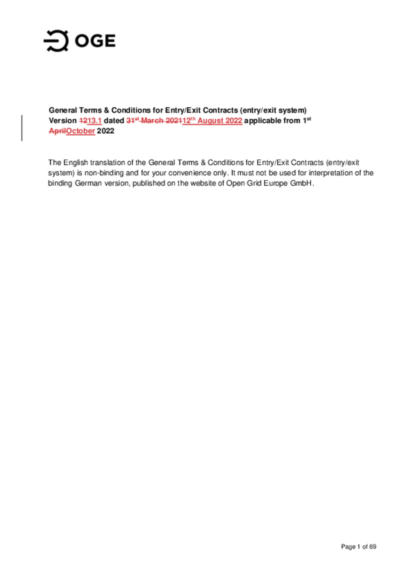 Price Sheet of Open Grid Europe GmbH for entry and exit contracts as well as internal orders in accordance with Cooperation Agreement XIII.1 in the market area Trading Hub Europe GmbH