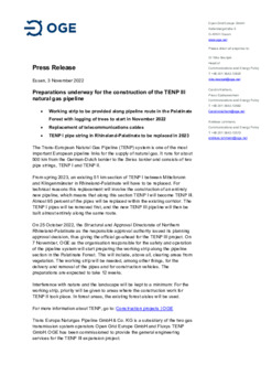 Working strip to be provided along pipeline route in the Palatinate Forest with logging of trees to start in November 2022. Replacement of telecommunications cables. TENP I pipe string in …Rhineland-Palatinate to be replaced in 2023.