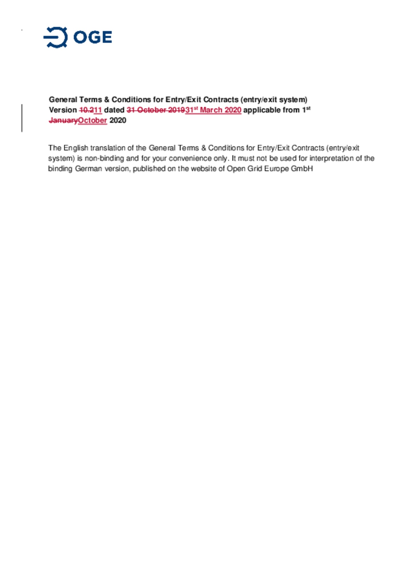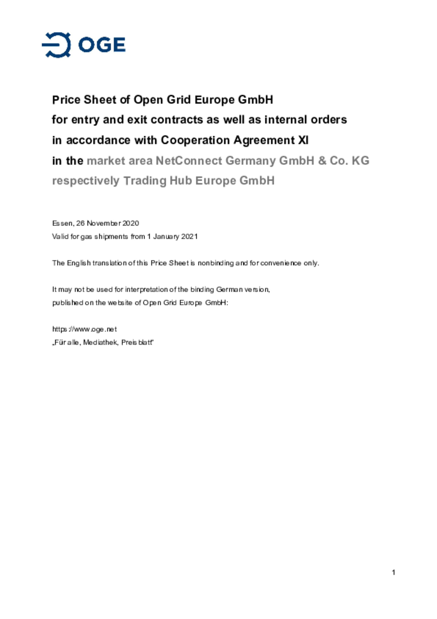 Price Sheet of Open Grid Europe GmbH for entry and exit contracts as well as internal orders in accordance with Cooperation Agreement XI in the market area NetConnect Germany GmbH & Co. KG respectively Trading Hub Europe GmbH