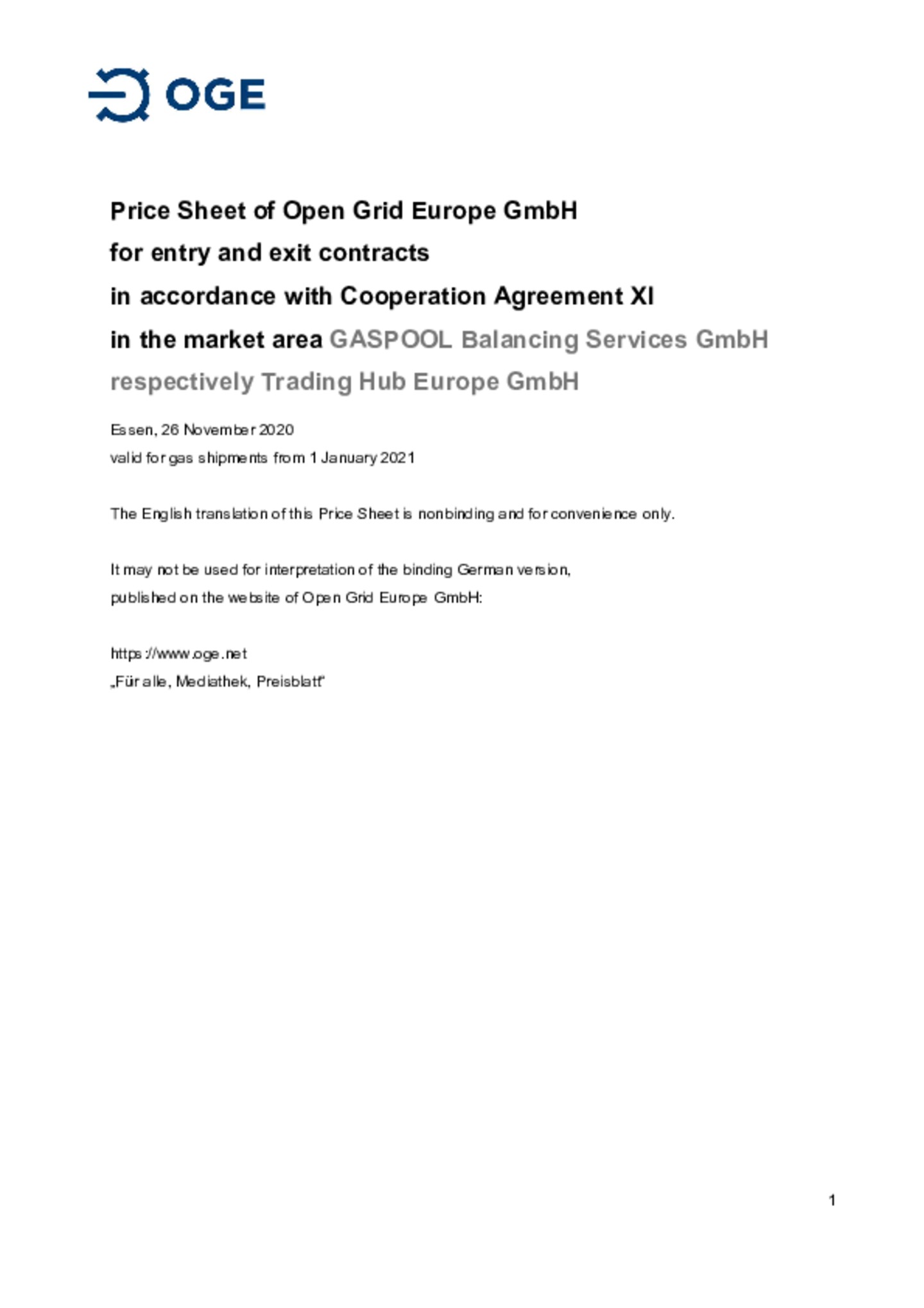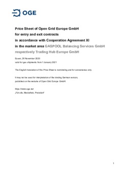 Price Sheet of Open Grid Europe GmbH for entry and exit contracts in accordance with Cooperation Agreement XI in the market area GASPOOL Balancing Services GmbH respectively Trading Hub Europe GmbH