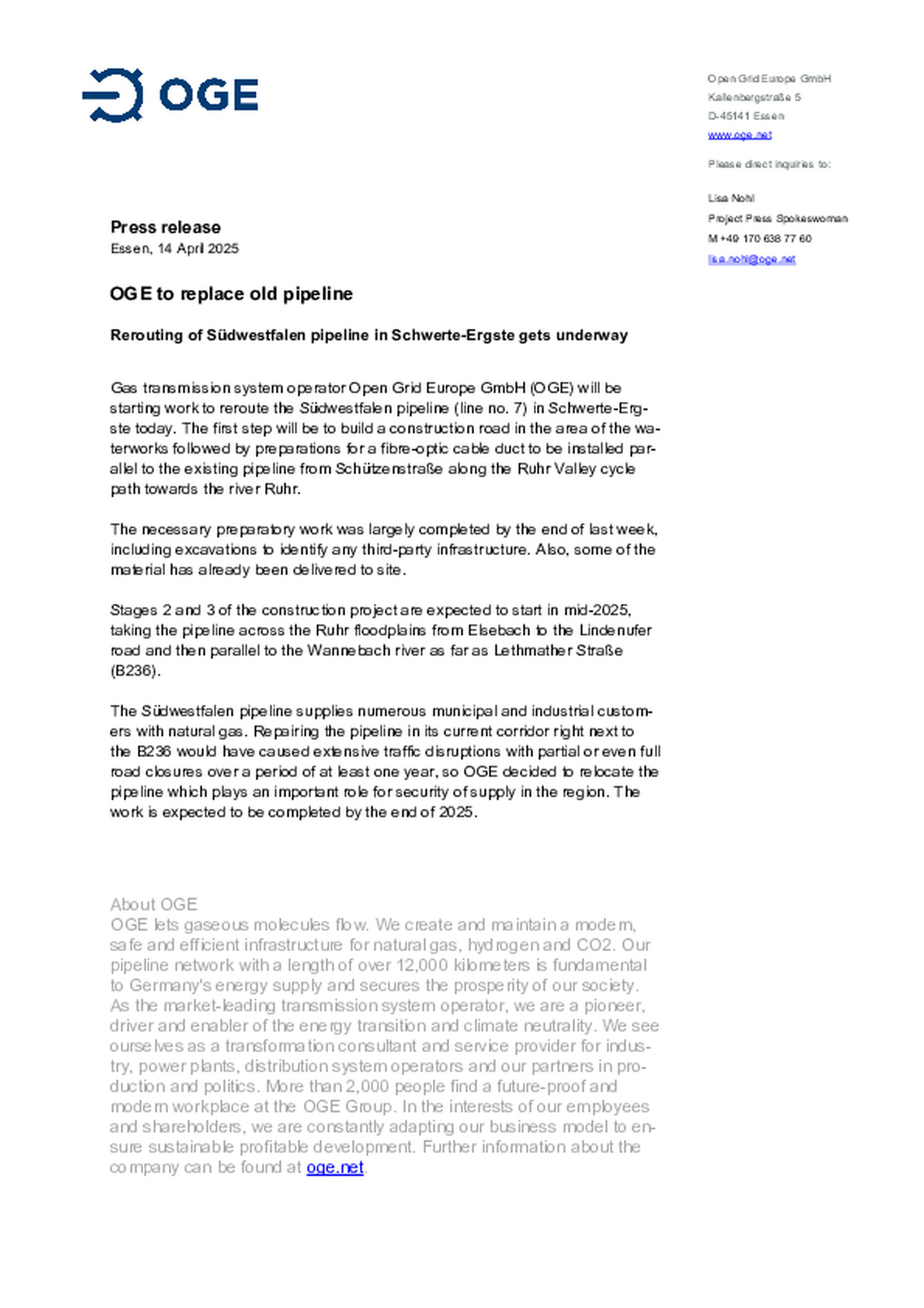Rerouting of Südwestfalen pipeline in Schwerte-Ergste gets underway