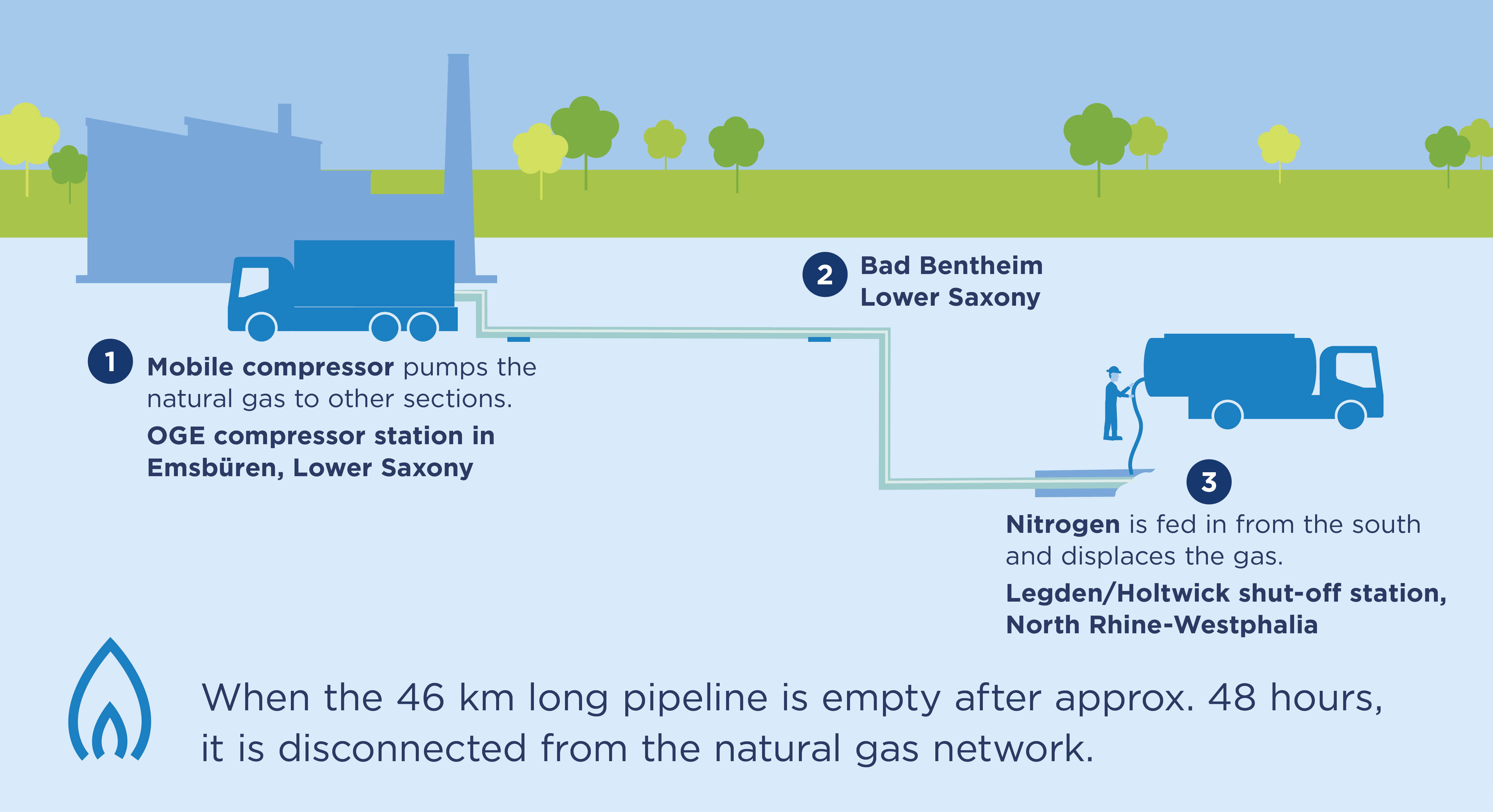 When a pipeline has to be converted, the first step is to pump the natural gas out of the relevant section. We have illustrated this for you using the example mentioned above: