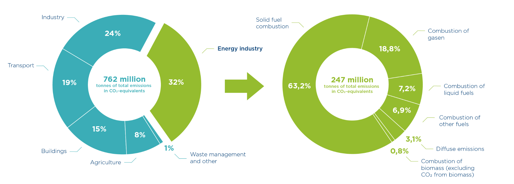 At 32 percent, the energy industry accounts for the biggest share of emissions in Germany. In 2021, its greenhouse gas emissions amounted to 247 million tons of CO2 equivalents, which corresponds to a reduction of 47 percent compared to 1990 levels. The emissions in the energy industry occur as a result of burning fossil fuels to produce electricity and heat, as well as in refineries and in fossil fuel transportation by pipeline. Furthermore, the energy industry is also responsible for so-called fugitive emissions. These occur, for example, as leaks of coal-bed methane from abandoned mines or methane from natural gas transmission systems.