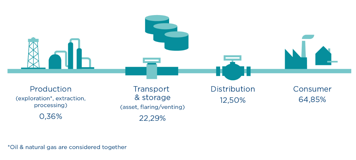 Apart from carbon emissions, methane is one of the key factors in man-made climate change, so it is of the utmost importance to continue reducing methane emissions. These occur, for example, in agriculture, waste management and also during gas transmission, when, for example, unburned natural gas is released into the atmosphere. Methane emissions account for 10% of Europe’s total greenhouse gas (GHG) emissions, and they were almost halved between 1990 and 2017. The oil- and gas industry is responsible for 6,2% of methane emissions (of which 24% occur during gas transmission and storage1), so OGE has a responsibility to society as a whole.