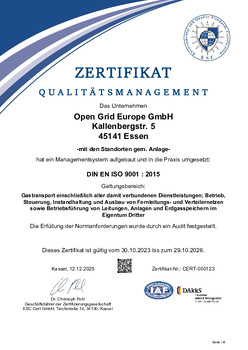 The certificates awarded to OGE confirm that our integrated QSE system meets all the requirements arising from legislation and applicable technical codes and standards, including DIN EN ISO 9001 for quality, DVGW Code of Practise G 1000 for technical safety management, the DIN ISO 45001 for health and safety, as well as DIN EN ISO 50001 for energy efficiency and DIN EN ISO 14001 for environmental matters.